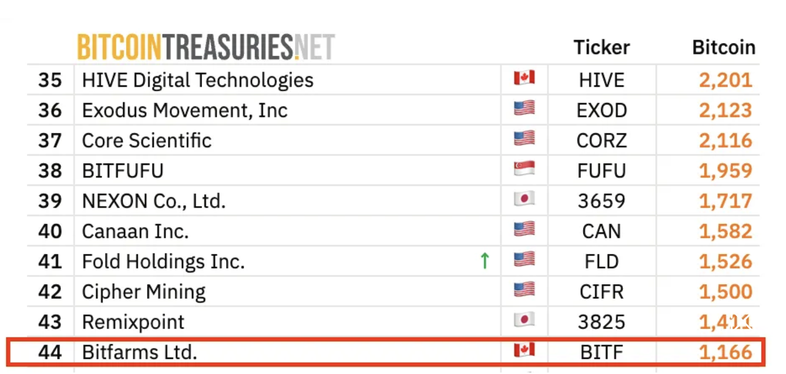Bitfarms ranks 44th among the largest holders of the leading cryptocurrency among public companies.