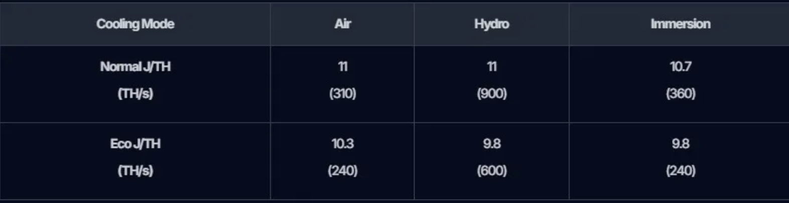 The liquid-cooled system provides 600 TH/s and 9.8 J/TH. The immersion variant offers 240 TH/s with a similar energy efficiency ratio.
